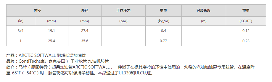 用途:一種適于在寒冷的環(huán)境中使用的,幼稚的汽油加油泵專用膠管。在溫度降到-65°F(-54°C)時,膠管仍然可以保持柔韌性。
