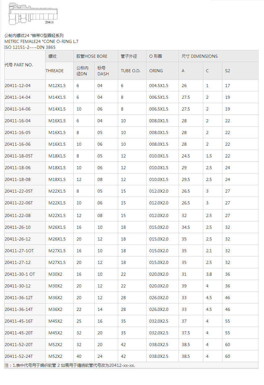 20411公制內螺紋24°錐帶O型圈輕系列